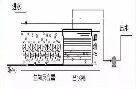把膜組件置于生物反應器內部。進水進入膜--生物反應器,其中的大部分污染物被混合液中的活性污泥去除,再在外壓作用下由膜過濾出水。